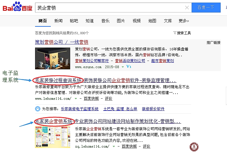 乐家装企营销系统是我给装企行业的伙伴们推荐的一个营销系统,我们可以在百度搜索装企营销,看看在百度上排名靠前的是谁家。如下图: