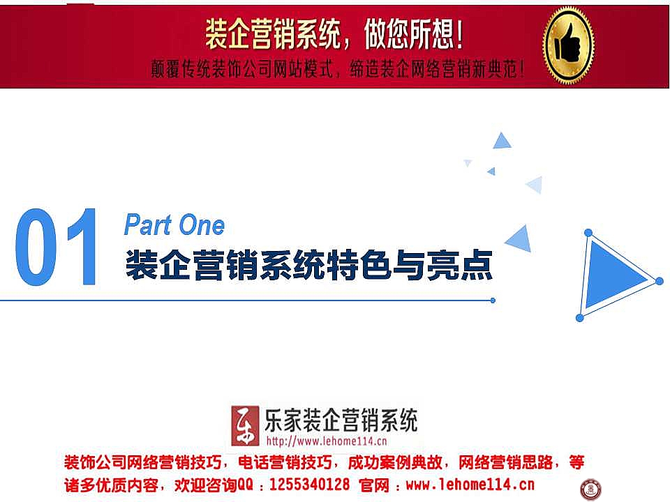 4.多样化的促销手段网络营销的手段要多样化。知道你公司和服务的人越多 ,选择你装修的客户就越多。网络营销的核心问题是如何吸引消费者 ,为其提供具有价值诱因的装修公司信息。网络营销较之传统的促销活动具有新的含义和形式。根据网络营销活动的特征和服务的不同 ,结合传统的营销方法 ,可采用网上折价促销、抽奖促销、积分促销、赠品促销、文化促销、联合促销和聊天促销等方法 ,同时可以选择好的搜索引擎 ,如 GOOGLE、SOHU、百度等进行市场推广,也可以选择与国内对家装的搜索引擎营销非常专业的家装平台装饰网展开广告合作或更大的合作。与传统的推广在网络上不能派传单,不能树广告牌,但这并不能阻碍网络的推广。各中小型装修公司可以根据自己的财力,设计水平和施工技术选择适当的推广方案。在网络上最近最热的SEO,与SEO实现:SEM,还可以通过博客,bbs,邮件营销,病毒营销,口碑营销等实现推广。在前期的推广中邮件、广告窗框的推广提高知名度的效果是最为明显的方法之一,而SEO是一个长期有效的,高效的推广方法,但实现网站的优化把SEO最终实现SEM这才是企业最终的目的,实现点击量转换成成交量这才是最终目的,在转换过程即时通讯是个很好的工具已被很多网站所使用。在3G时代的来临这也为网络营销手段的不断丰富提供了一个很好的工具,对于中小型装修公司如何设定网络营销的策划可以根据自己户群资源,技术选择适合自己的方法实现网上营销。
