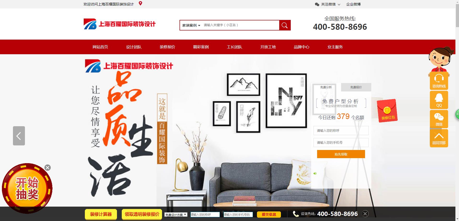 乐后屋装企营销平台热烈祝贺上海百耀装饰2018版官网上线!新官网内容丰富,栏目齐全,而且支持电脑,手机,微信公众号三网平台接入,更加适合业主的多方面浏览习惯。公司的新官网自上线以来,经过几日的调试,稳定,已经完备,业主可以进入官网完成很多自助装修预约,咨询服务,比如预约设计师,预约查看在施工地,参加活动报名以及抽奖,我们都有在线客服,一对一解决业主的装修疑问咨询。