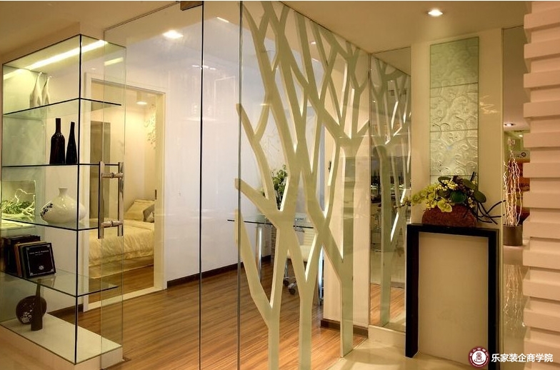 4、推拉门制作工艺:做工与其他门叶大致相同,轨道要隐藏在门套内,玻璃两边要用定做的实木小线条夹住,地面定位器要牢固,位置要合理。